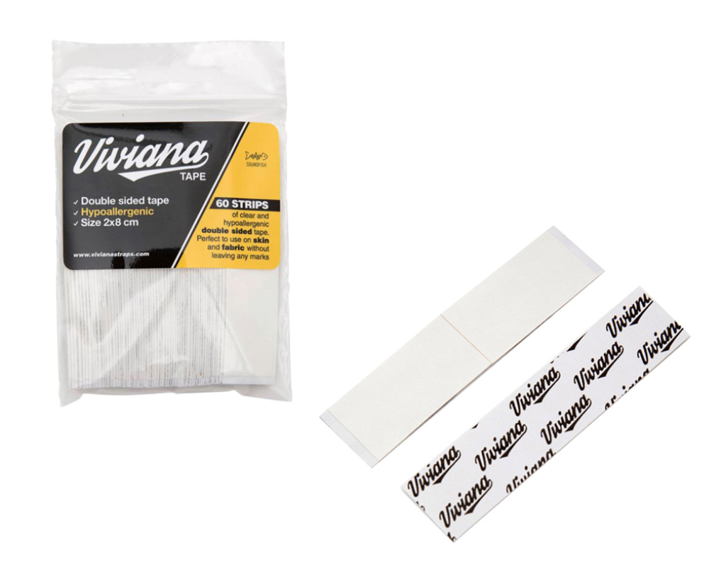 A super-sticky, double-sided, hypoallergenic clear tape that leaves no marks. For use on skin and fabrics.