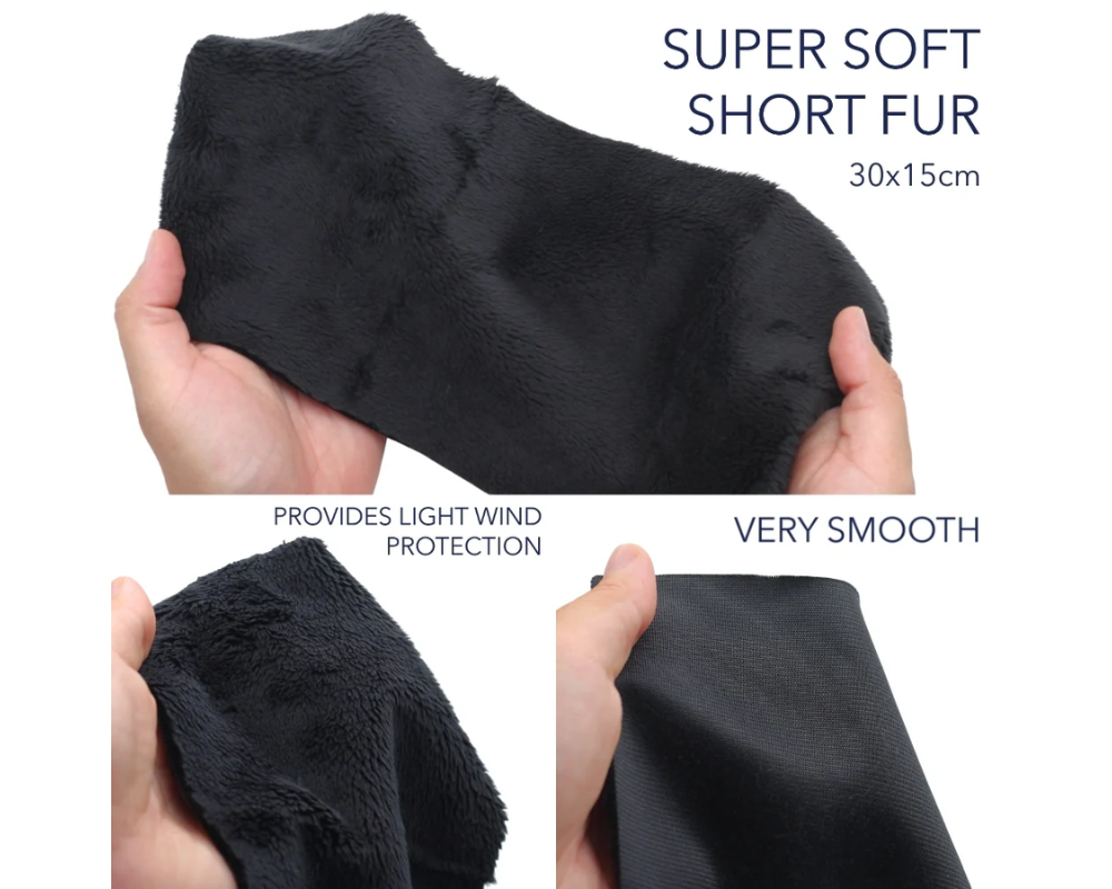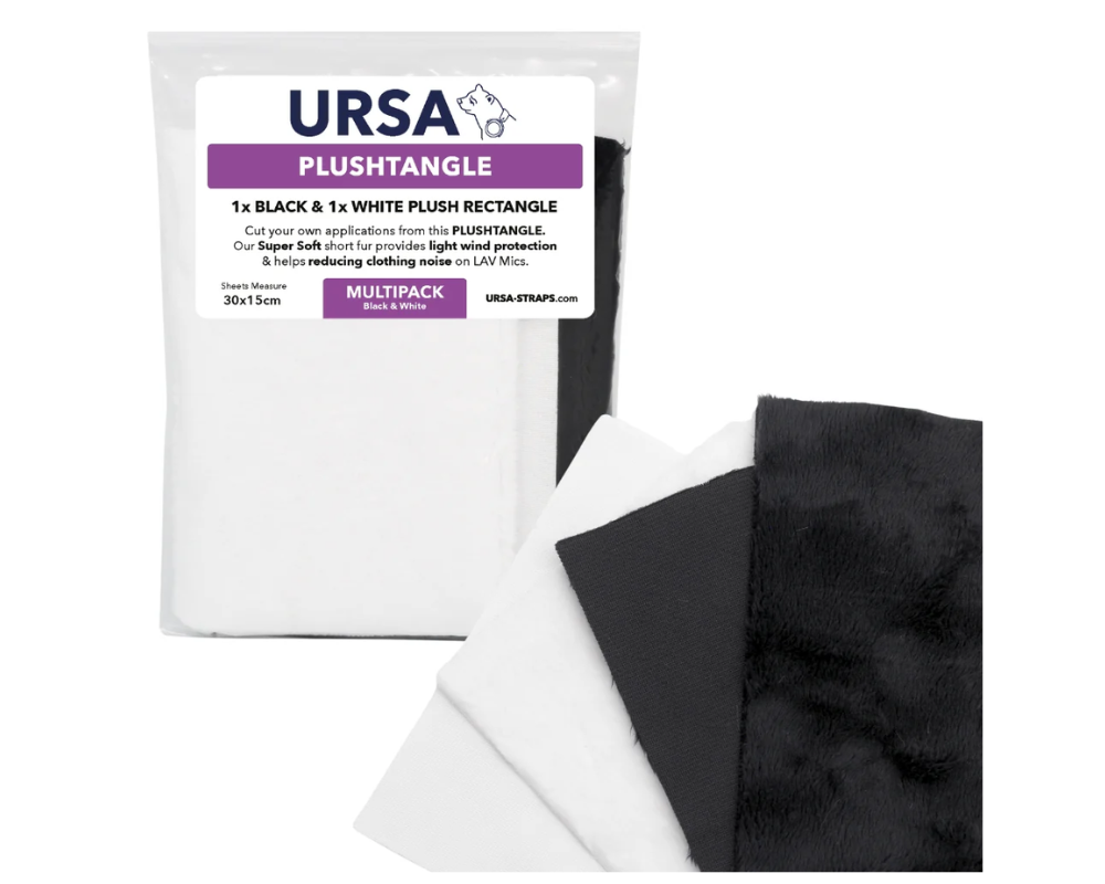 URSA Plush TanglePlush Tangles are sheets of Plush Fabric which you can cut to shape to reduce wind noise and clothing rustle for LAV mics. Pack Contents: 1x Black & 1x White Plush Rectangle. In each pack you get two 30 × 15 cm sheets of soft, 5 mm‑pile Plush Fur. Simply cut each piece to the size you need. A small strip between the mic and a scratchy fabric takes the edge off rustle, a larger patch wrapped around the end of the capsule adds wind protection. The underside is soft and takes well to sticky tape allowing you to tape your cut‑outs in place using URSA Sticky Strips or Premium Sticky Squares. The two sheets will give you plenty of custom covers!