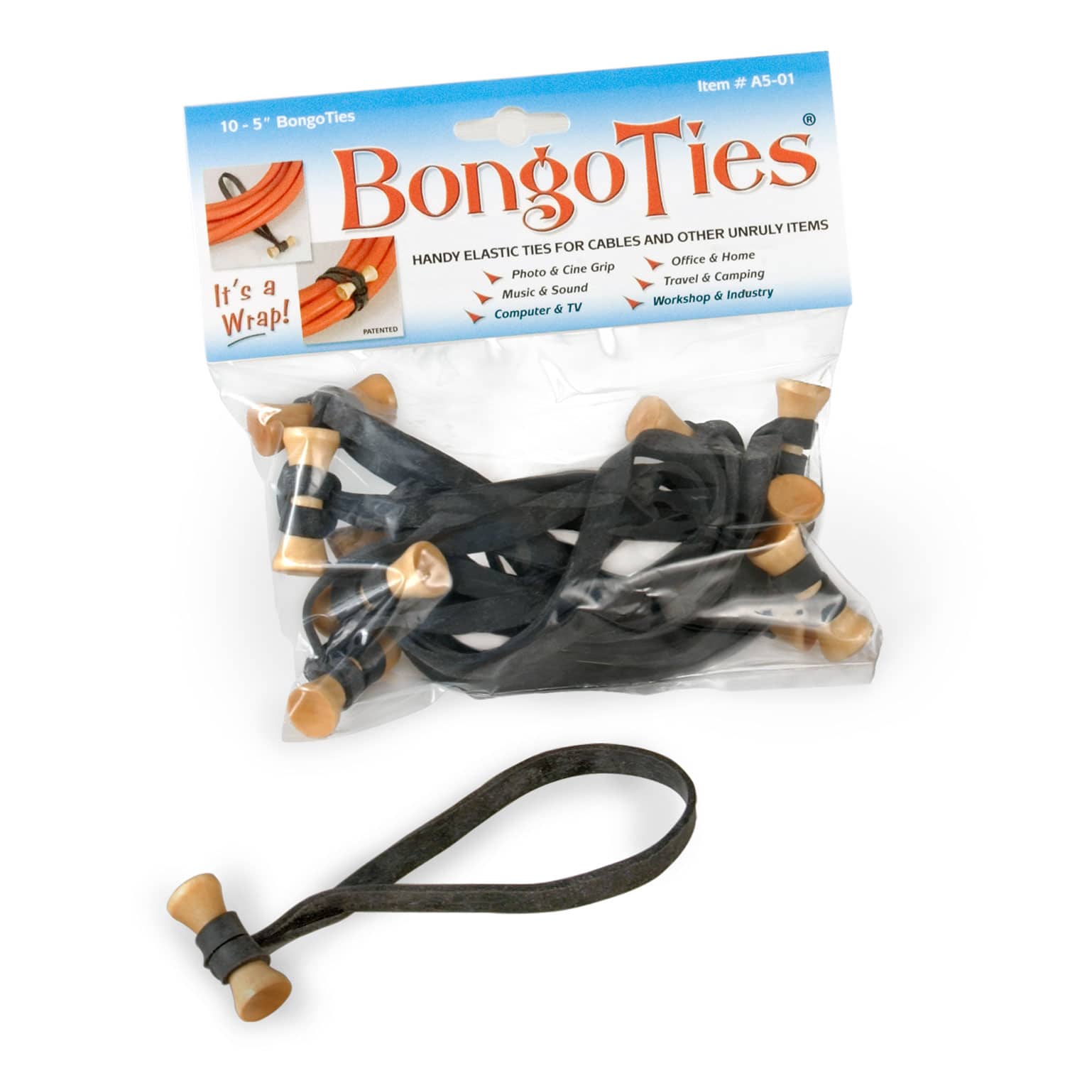 Bongo Ties!Handy elastic ties for unruly items - Bongo Ties make organising loose and unruly items quick and easy. Use for binding when storing your cables, dressing cables for neatness or hundreds of other uses during your production day. The binding closure is accomplished with a simple button type design. This incredibly useful tool is made of high quality natural rubber and wood. Sold in packs of 10 and now available in a wider selection of colours. Original: Black band with natural toggle Lava: Black band with red toggle Azure: Black band with blue toggle Tree frog: Black band with green toggle Obsidian: Black band with black toggle